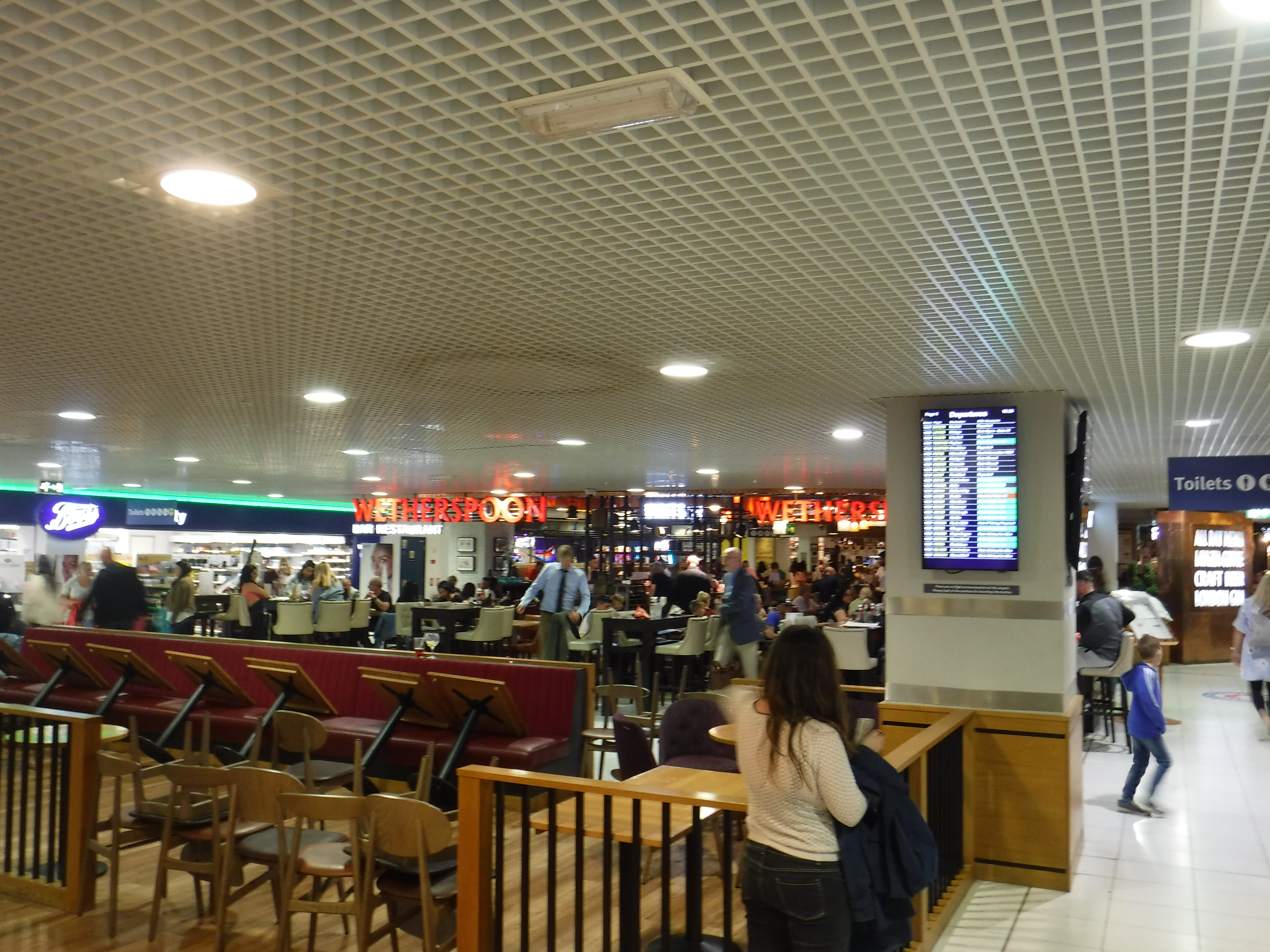 Terminal pierwszy nie przeszedł remontu od siedmiu lat, to nic dziwnego, bo wtedy ukończono ostatni remont, ale – po pierwsze przestrzeń pierwotnie przeznaczoną dla pasażerów wypełniają teraz kawiarnia, bar szybkiej obsługi i o zgrozo – pijalnia piwa (pub dla nieświadomych)! Czyli, że po pierwsze znacząco zmniejszono liczbę dla oczekujących pasażerów, a po drugie nie dość, że większość wspomnianych pasażerów na lotnisku doprawia się piwskiem i chodzi napruta (no, ci bardziej wysublimowani mogą się napić Prosecco w firmowym bufecie, no i chodzą ubzdryngoleni, bo naprucie im nie przystoi), to jeszcze dają upust swoim chuciom i potrzebom w sąsiedniej toalecie. Dzięki temu nie tylko brodzi się tam po kolana w moczu, a ścieżkę wskazują wszechobecne drogowskazy z powyciąganego papieru toaletowego, ale też w kabinach czekaja wszelakie niespodzianki, od „oczywistych” po zużyte środki antykoncepcyjne użytku zewnętrznego (nie, nie chodzi o maści). Korzystając przypomniał mi się monolog pana Abelarda Gizy poświęcony toaletom publicznym. Polecam obejrzeć w zakamarkach jutuba.