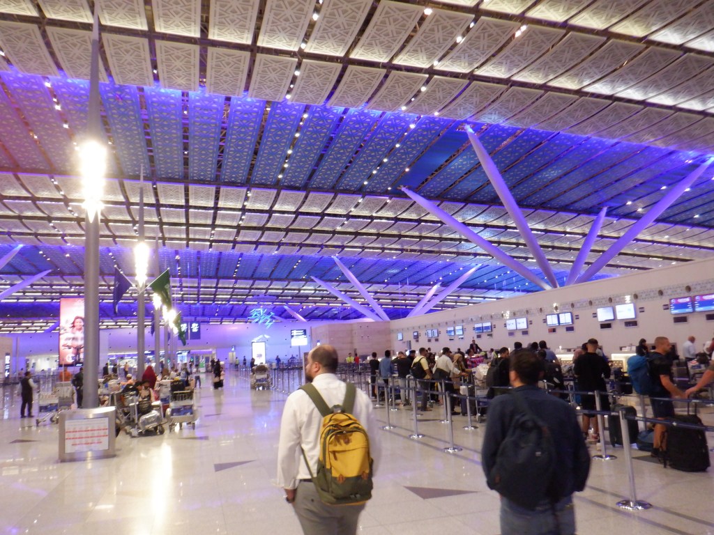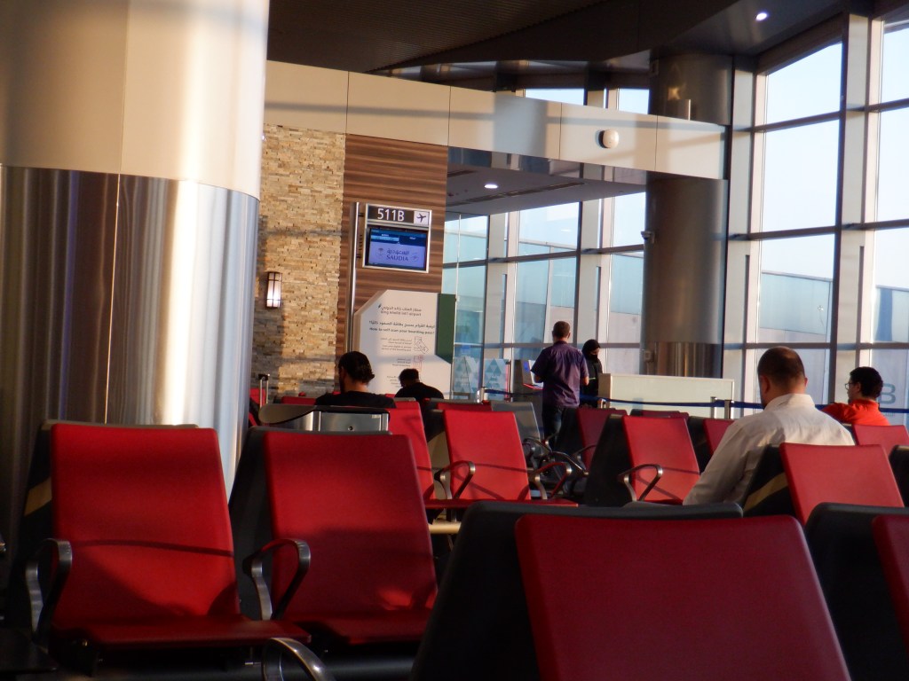 Bo oczywiście trzeba zacząć od przyjazdu na dworzec lotniczy. Krajowy. Bo w Rijadzie są oddzielnie, ten krajowy otwarty w 2016. roku, to taki średni jest. Znaczy ładny i czysty i wodę można też wnieść, ale osoby które na nim pracują, jakby mają świadomość, że są „tymi gorszymi”. Znaczy w porównaniu, od tych co robią na międzynarodowym. Więc też się im jakby mniej chce. Wejściówek nie wydrukują, bo po co, jak się ma już na kartce, na połączenie nie odprawią, bo można na kolejnym lotnisku, itp. Poczekalnia ujdzie, choć, w porównaniu na przykład do lotniska międzynarodowego, nie ma urządzenia sprzedającego tanią wodę po 2 zł. Na szczęście, można ją, jak i inne napoje, zabrać z domu.