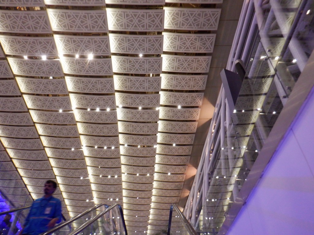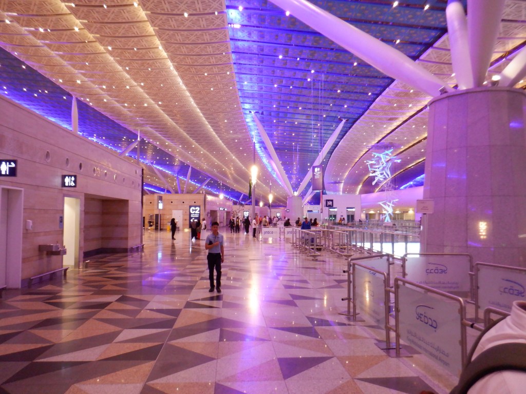 Dworzec lotniczy w Dżudżdie też robi wrażenie (nie tylko tym, że nie ma desek na muszlach w ustępach). Mimo tego, że otwarto je ładnych parę lat temu, jest wciąż czyste i eleganckie. Dostosowane oświetlenie łagodnie dopełnia rzeźbionych płytek stalowych, czy tam gipsowych. Jest też przestronne i wygodnie. Dużo jest ustępów (no, bez desek) w których zawsze jest jakiś czyściciel, jest gdzie usiąść i internet jest nawet. Ale książki to drogo sprzedają, na przykład. (Oczywiście o napojach nie trzeba wspominać, bo te można wziąć ze sobą z zewnątrz).