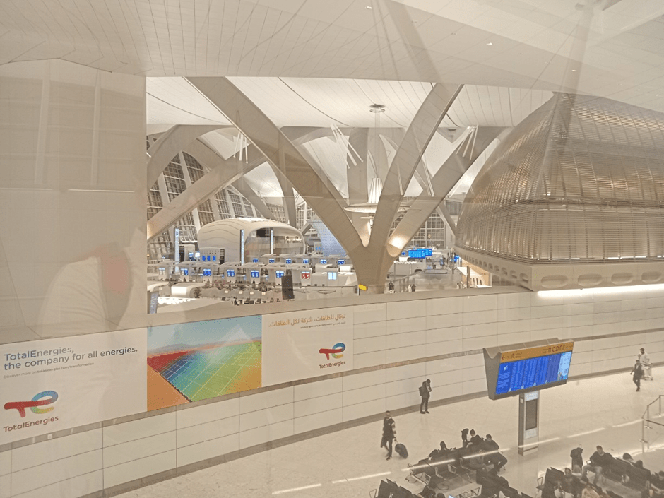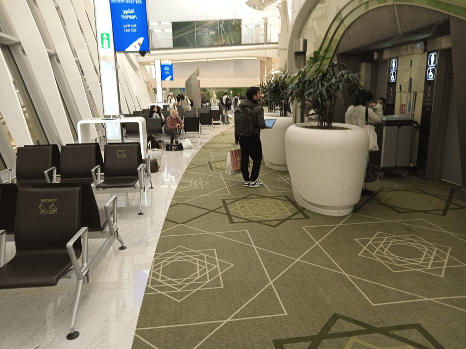 Po drugie – podobnie jak w Dausze (i w jakimś stopniu w Dubaju) na wzór brytyjski wprowadzono klatki do czekania na peronach. Czyli, że przed odlotem otwiera się taką klatkę z miejscami siedzącymi przeznaczonymi dla podróżnych z danego lotu, w której mają oczekiwać na przygotowanie samolotu. Można tam wejść, ale wyjść już nie I w porównaniu do takiego na przykład Kataru, zadbano oto, żęby w tej oddzielonej przestrzeni znalazł się ustęp, to jednak jest on tylko jednoosobowy.